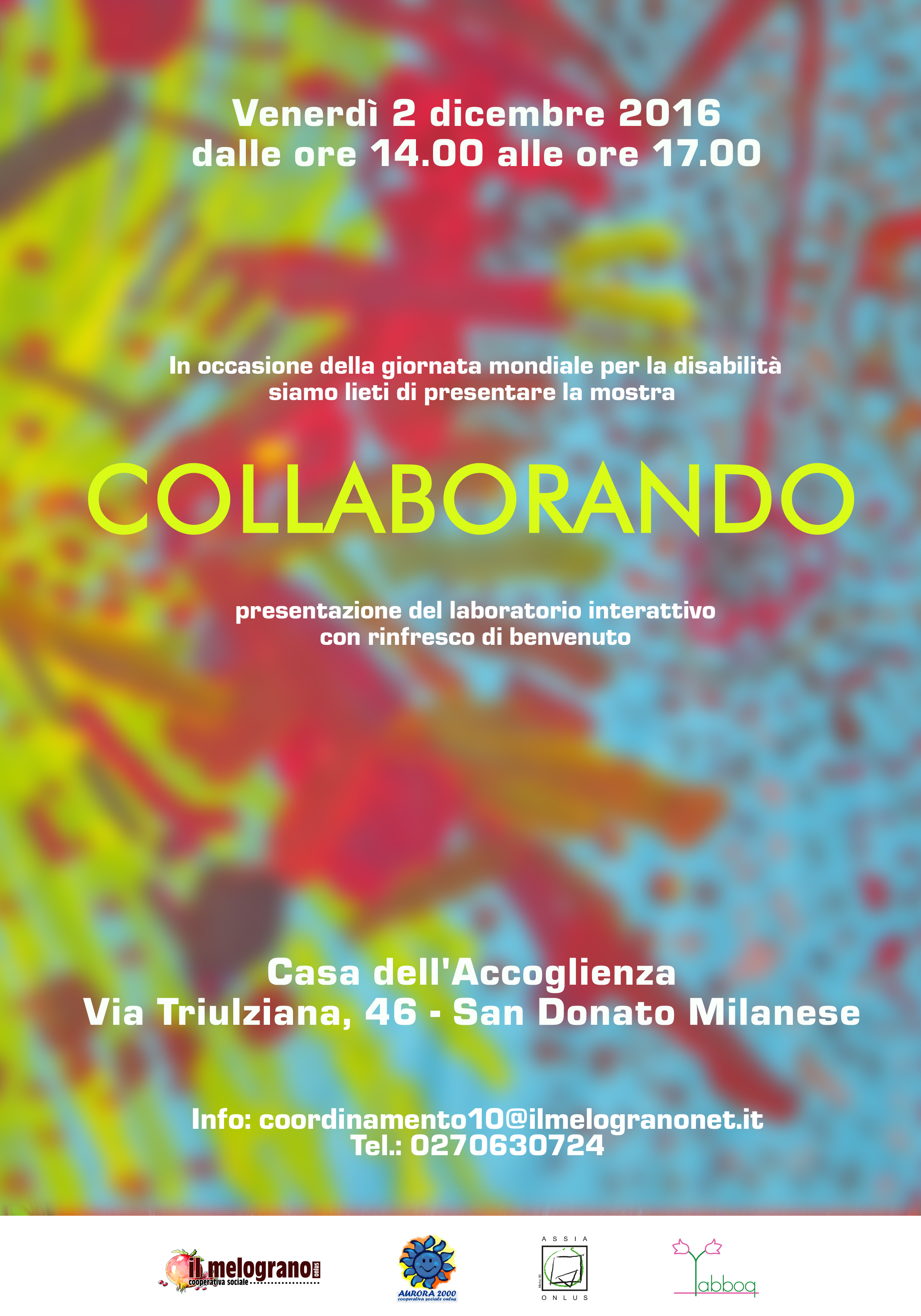 In occasione della giornata mondiale della disabilità, ASSIA, Aurora 2000, Il Melograno e Yabboq hanno il piacere di invitarvi il prossimo 2 dicembre alla mostra “Collaborando” presso la casa dell’accoglienza di San Donato Milanese. Una raccolta di quadri, opere e manufatti realizzati dai ragazzi che frequentano i nostri centri diurni. Sono previsti laboratori interattivi, proiezione di filmati e rinfresco di benvenuto.