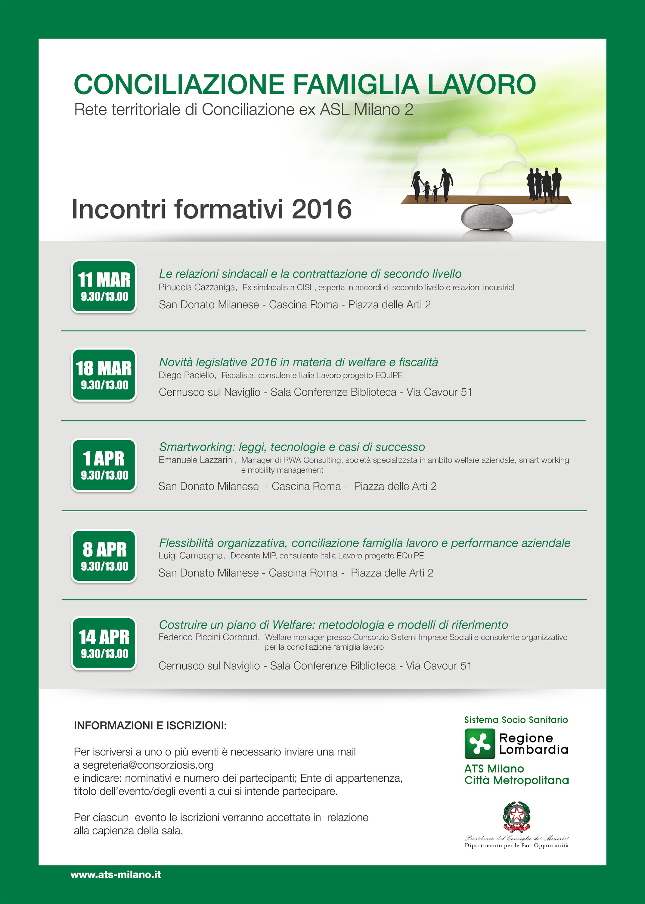 Nell'ambito del progetto "Complessi Equilibri" da marzo ad aprile 5 nuovi incontri formativi sui temi della conciliazione dei tempi di vita famigliari e lavorativi. Gli incontri sono rivolti agli operatori dei servizi pubblici e privati e alle aziende interessate. Clicca sul titolo per visualizzare il volantino con le date degli incontri e tutte le informazioni relative