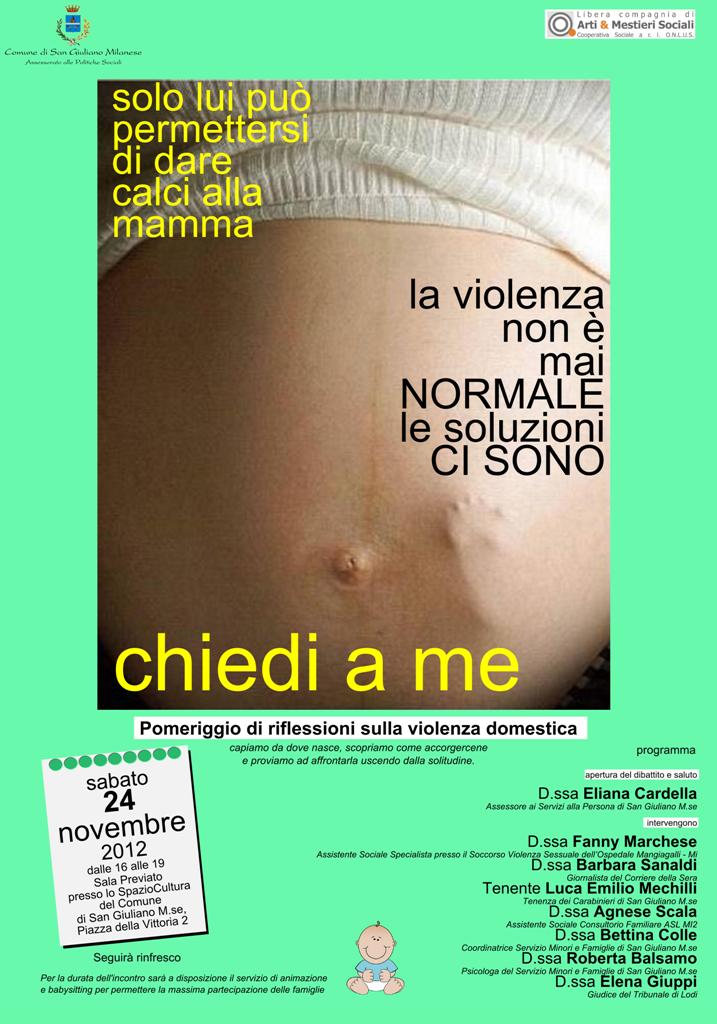 La Libera Compagnia di Arti e Mestieri Sociali (coop. sociale onlus) col patrocinio del Comune di San Giuliano Milanese organizza un pomeriggio di riflessioni sulla violenza domestica con esponenti dei servizi sociali, dell'autorità giudiziaria e delle forze dell'ordine.